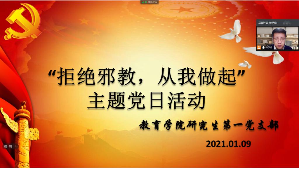 研究生第一党支部采取腾讯会议的方式,开展“拒绝邪教,从我做起”主题党日活动暨“灯塔大课堂”第十六课集体学习活动。活动由研究生第一党支部书记岳伊明主持,支部全体党员参加活动。