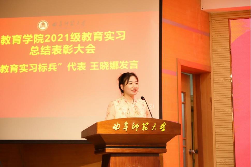 “教育实习标兵”代表王晓娜、“教育实习先进个人”代表刘晓倩依次上台发表实习感悟,向在场同学分享实习经验,反思实习中的问题与不足,并表示通过本次教育实习,更加坚定了成为一名教师的职业理想。