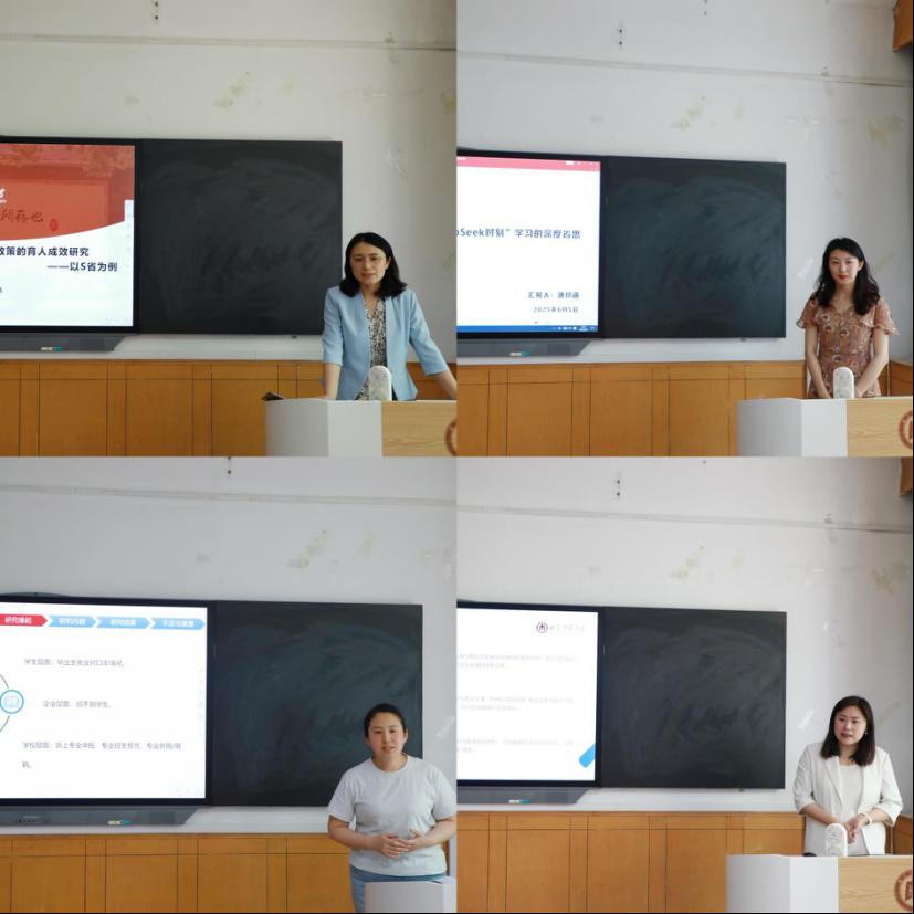 与会师生围绕教育领域热点议题展开了多维度、深层次的学术交流。在学术分享环节,四位博士生分别就普通本科高校自主政策、“deepseek时刻”学习的深度省思、产教融合共同体、专业群书证融通机等议题进行了精彩汇报,结合实证研究与理论建构呈现前沿思考。评委老师从学术创新价值、理论框架深度与实践指导意义等维度进行专业点评,提出了宝贵的建议,为同学们后续研究深化提供了清晰的方法论指引。