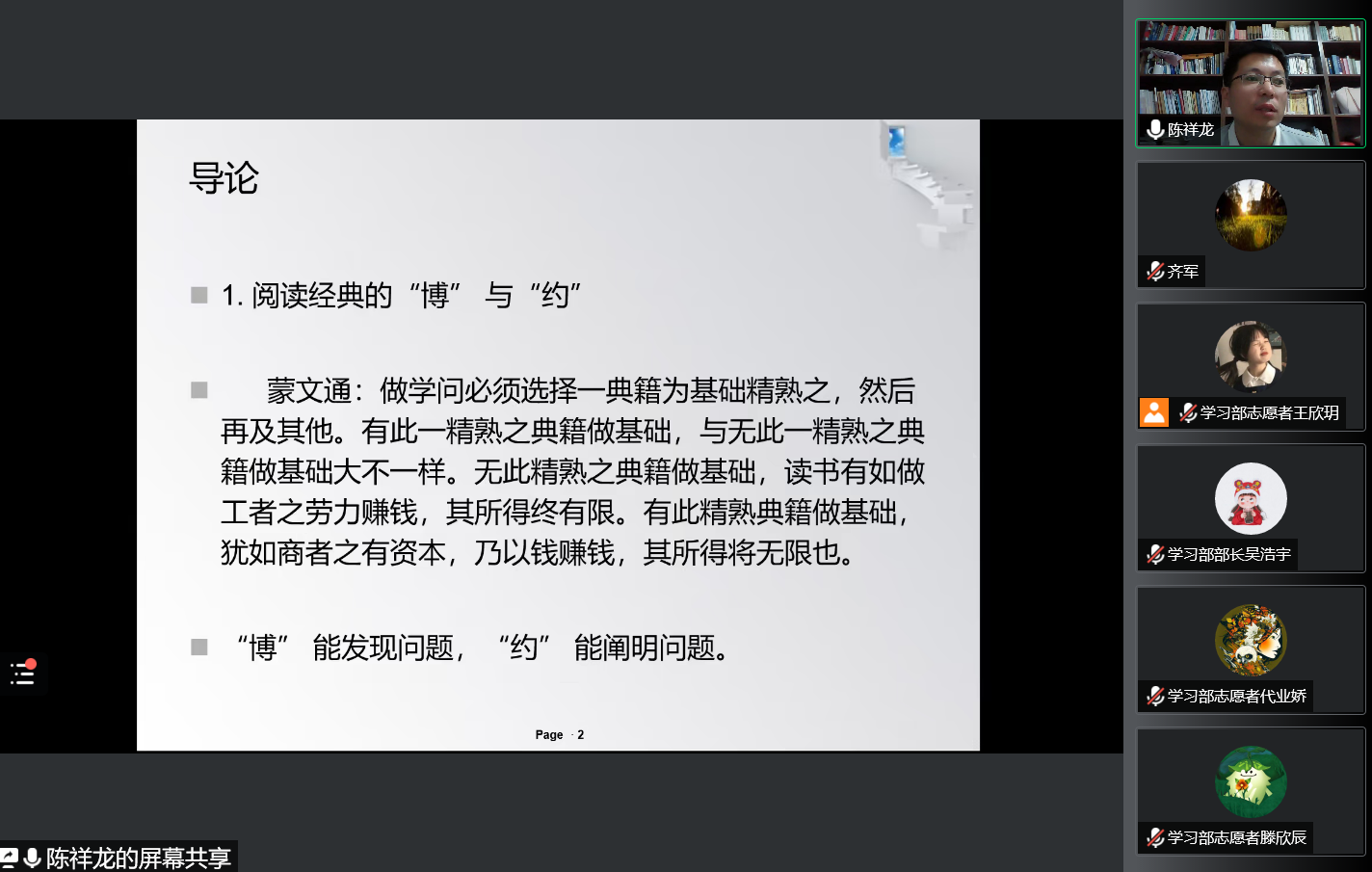 报告会上,陈祥龙老师以《论语》首章为例,谈论对经典阅读的感受,与大家分享了经典阅读中“博”与“约”、“逆流而上”与“顺流而下”、“问题导向”与“学科立场”三个问题,并对《论语》中的学文与学道、时时与适时做了区分。最后,陈祥龙博士强调,教育是缓解焦虑最好的手段,有对学习的志向就会克制外界的吸引,保持问题意识是做学术研究的最基本要求。