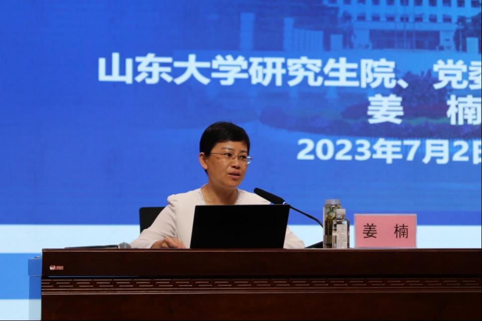 报告会上,姜楠主任从研究生导师队伍存在的五类主要问题出发,对相关政策展开分析,强调加强研究生导师队伍建设是引导研究生教育高质量发展的必由之路。同时,姜教授从“选”“培”“领”“评”四个层面分享了山东大学在新时代导师队伍建设中获得的成功经验,她指出,应将完善推广“导师+”团队育人模式、建设交叉融合育人团队作为未来导师队伍建设的重点,全方位、立体化构建新时代研究生导师发展体系。最后,姜教授指出,社会之尊者、心怀国之大者、立德树人之能者是谓大先生,并鼓励各位导师不仅要做学生学习道路上的引路人,更要成为学生为学、为事、为人的榜样。