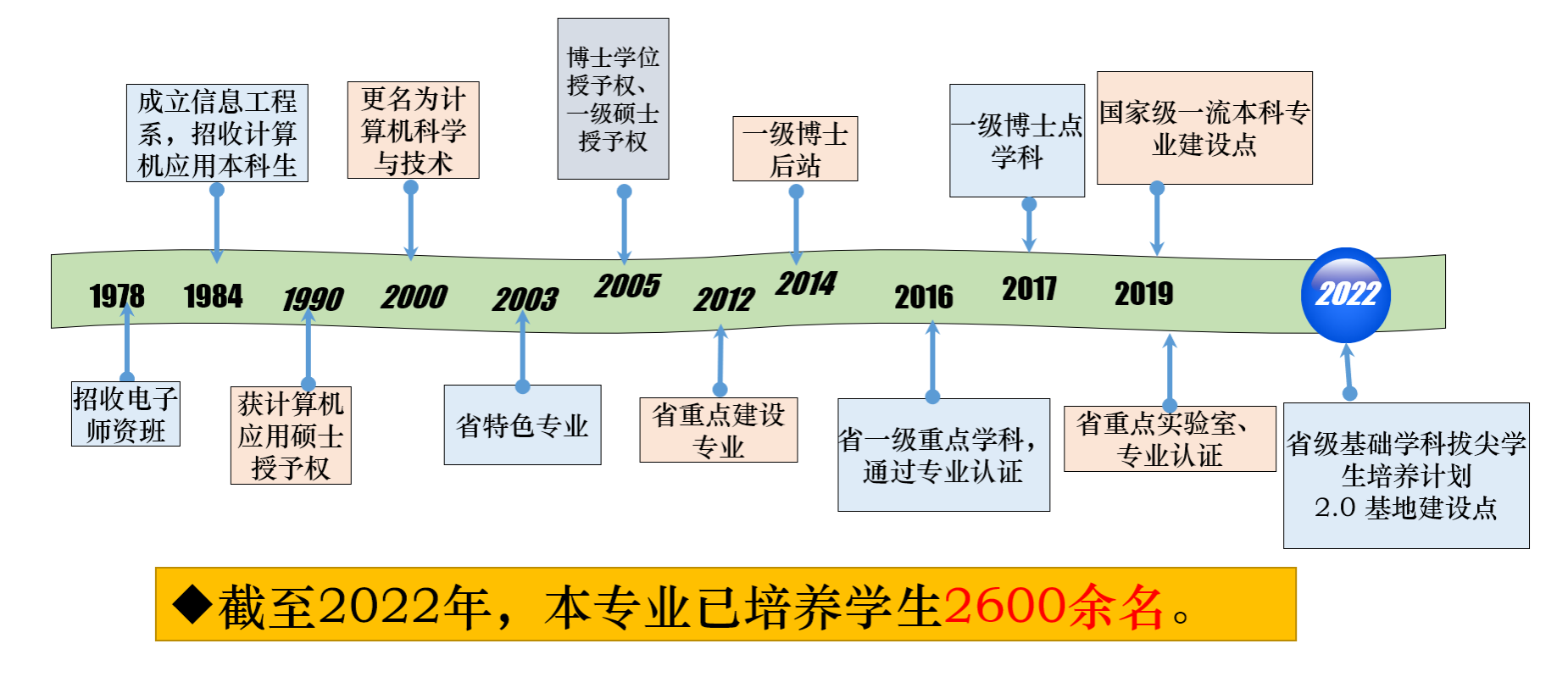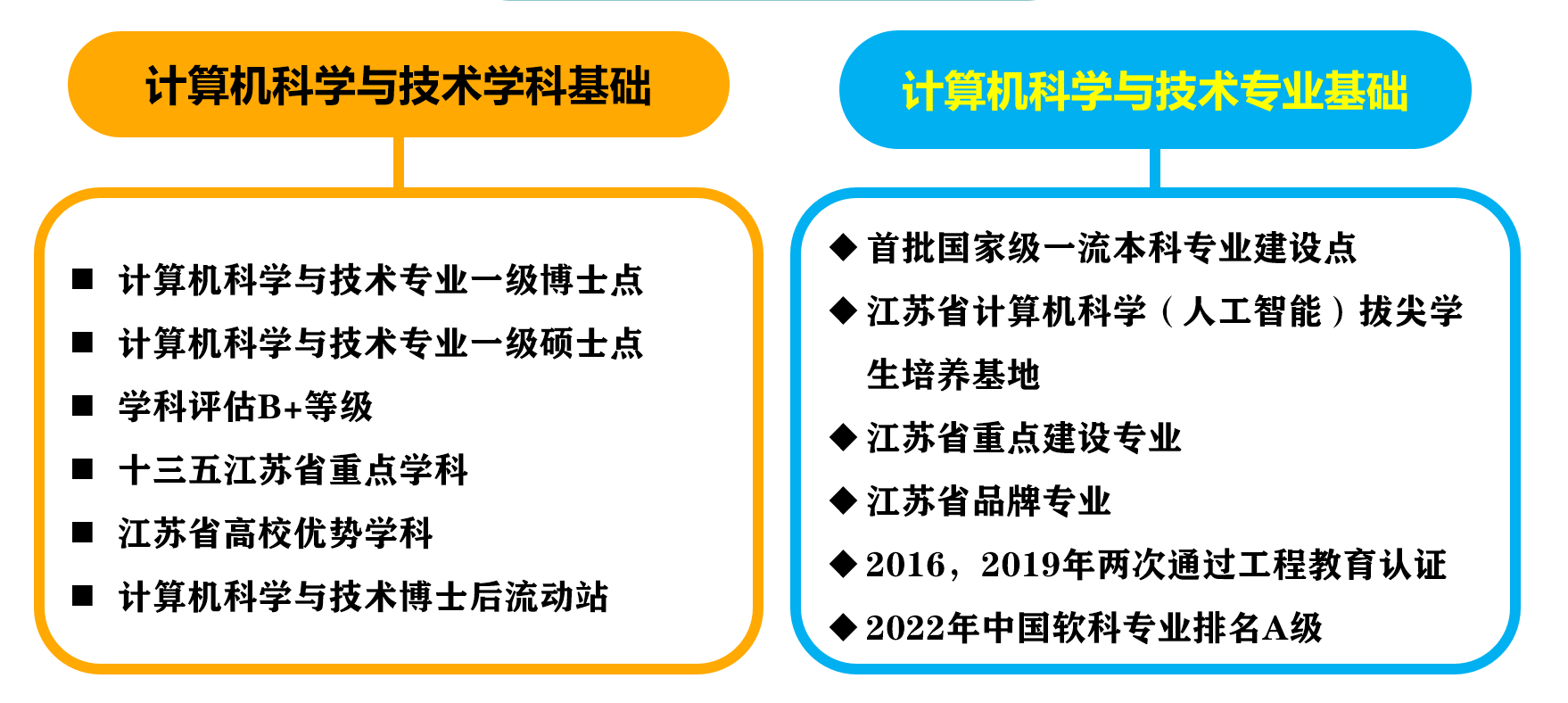 2012年本专业成为江苏省重点建设专业。2014年获批计算机科学与技术一级学科博士后科研站。计算机科学与技术学科于2016年获批江苏省一级重点学科、2017年获批一级学科博士学位授予权,在全国学科评估中获B+等级。2018年获批江苏省优势学科第三期建设项目。2019年获批国家首批一流本科专业建设点,专业2016、2019年两次通过工程教育专业认证。2022年获批江苏省基础学科拔尖学生培养计划2.0基地-计算机科学(人工智能)拔尖学生培养基地。是江苏省人工智能与智能制造重点产业香港世博娱乐城