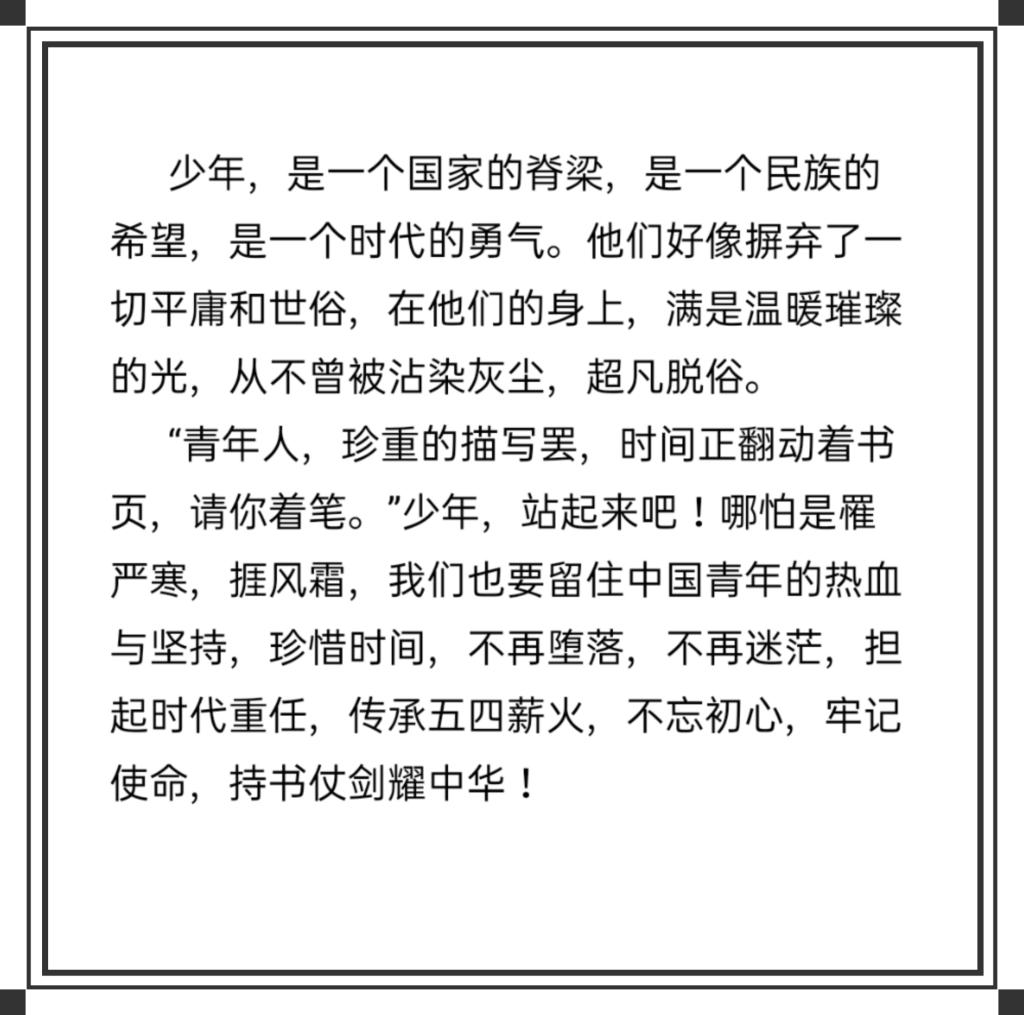 征文要求以五四青年节为背景,以歌颂党的丰功伟绩,以爱党、爱国、敬业、乐业为主要内容,主题鲜明,立意新颖,内容积极向上,思想性教育性强,能够充分展现当代大学生的良好精神风貌。征文比赛中同学们积极参与,踊跃来稿,用自己的笔记录了对祖国的热爱。经过评选,在本次征文比赛中,于小迪荣获一等奖,张凤娟、孙秀芝、杨寒超荣获二等奖,范志星、刘华倩、刘怡菲、王春婷、周四琳荣获三等奖。