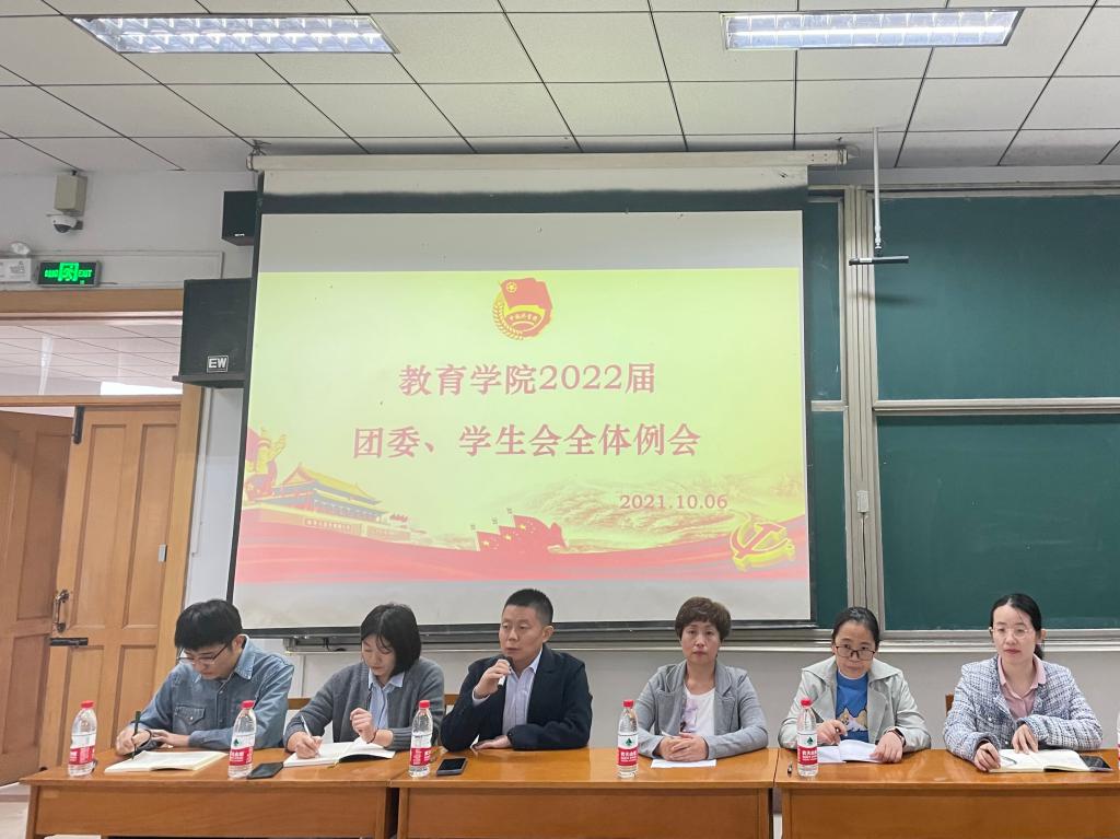 2022届团委、学生会全体例会在综合楼401教室顺利召开。出席本次会议的领导老师有党委副书记孙超、团委书记周长缨、2018级辅导员王保英、2019级辅导员商雪敏、张东霞。本次会议由学生会主席庞霄汉主持。