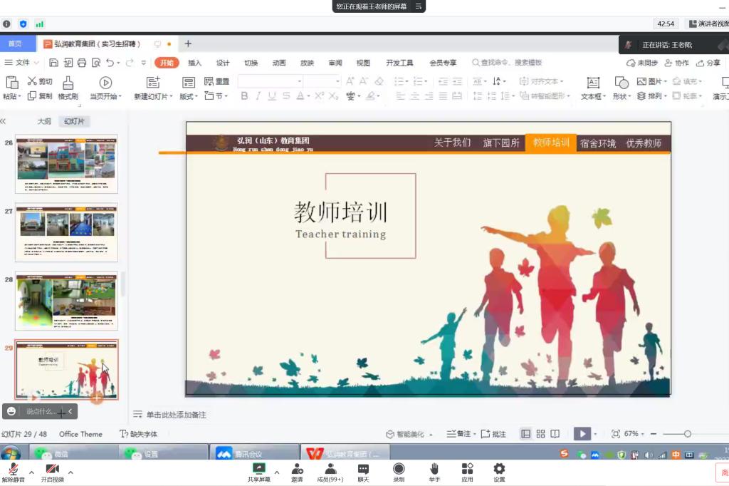 王月华介绍了弘润教育发展集团的发展历程和教学理念,重点展示了弘润集团旗下园所和宿舍环境,介绍了教师培训课程的主要内容和优秀教师的工作经历,充分体现了幼儿园内良好的工作环境和氛围。最后,王月华介绍了弘润教育发展集团的招聘需求和福利待遇,真诚希望香港世博娱乐城