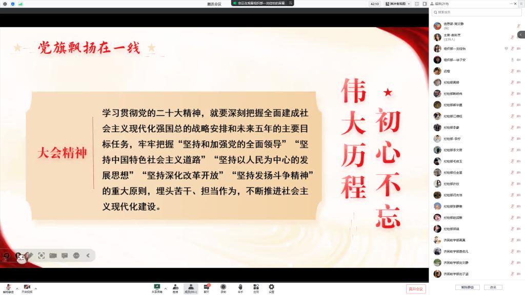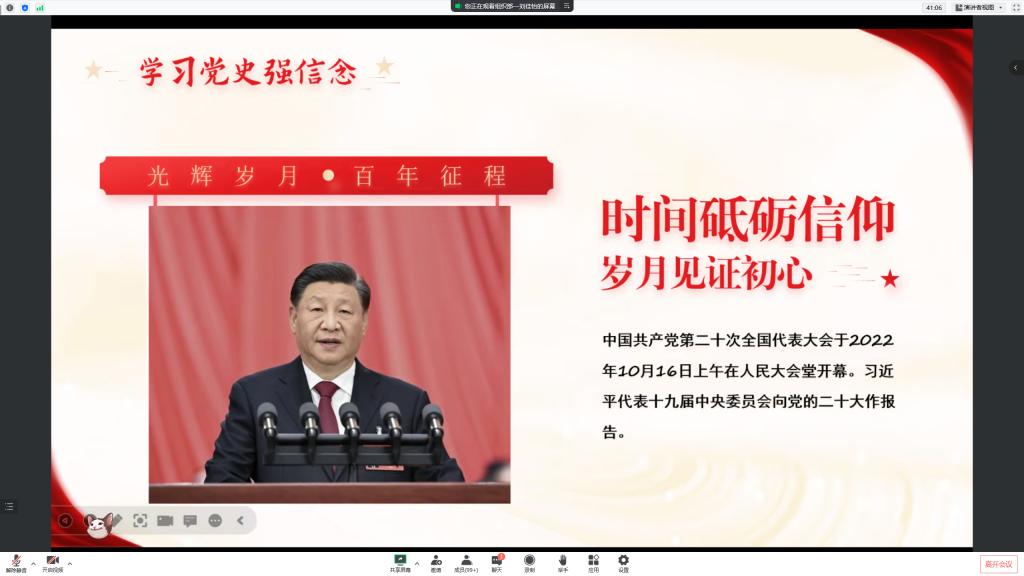 会上,团委学生会全体学生干部集中回顾观看党的二十大盛况及党的二十大报告中的金句视频,深刻学习领会党的二十大精神。随后,院学生会组织部副部长徐子安带领全体成员从党的二十大的背景、大会主题、大会精神等多方面展开系统全面的学习。