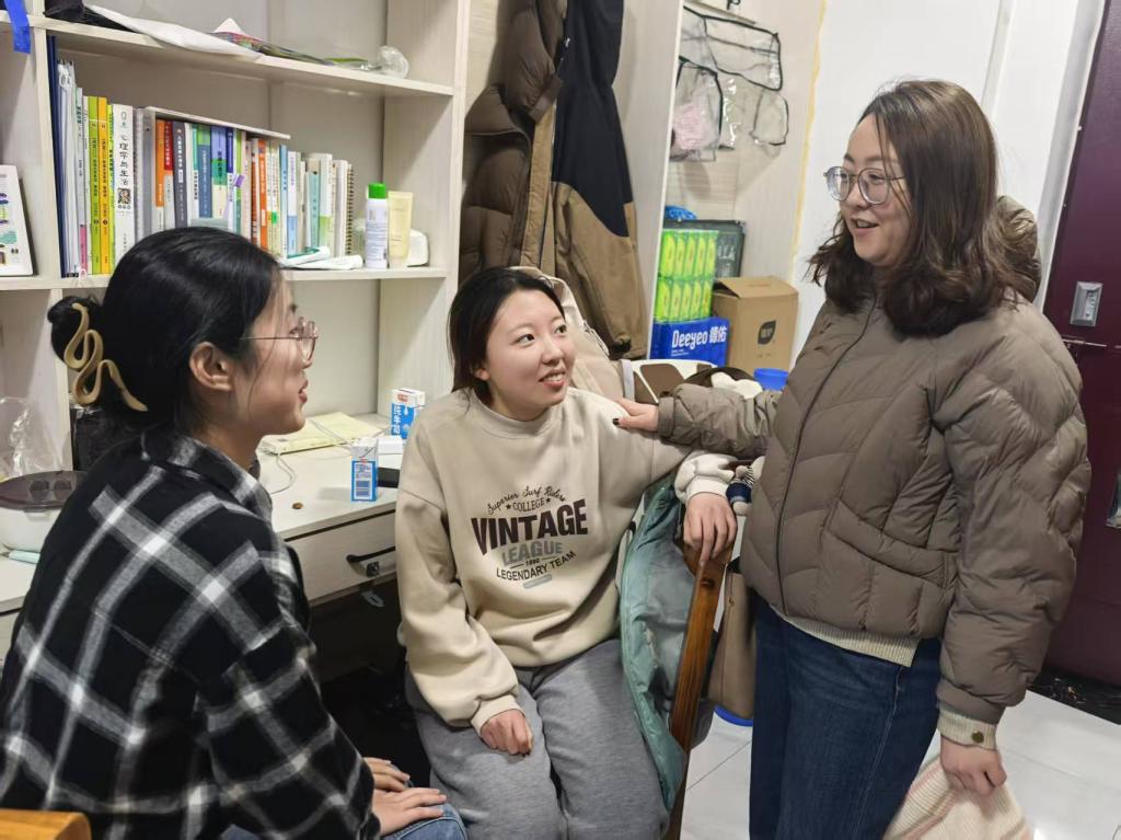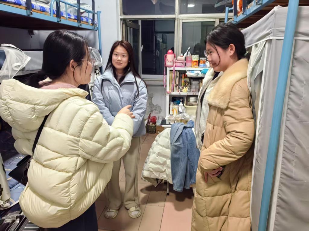 辅导员深入学生宿舍,细致询问学生寒假生活、和返校适应情况等相关事宜,并叮嘱学生在日常生活中务必注意宿舍用电安全,及时调整作息以适应新学期学习节奏。辅导员们还与学生深入交流,现场解答同学们关于课程、就业及未来规划等疑问,并为学生们送上新学期的鼓励与祝福。