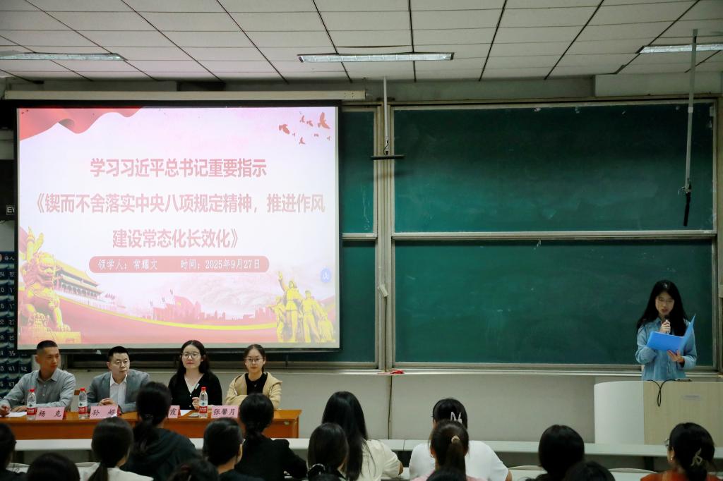 会议第一项,团委组织部副部长常耀文带领同学们学习习近平总书记重要指示《锲而不舍落实中央八项规定精神,推进作风建设常态化长效化》,帮助大家将规则意识内化于心、外化于行,锻造优良作风,切实发挥学生骨干的先锋引领作用。