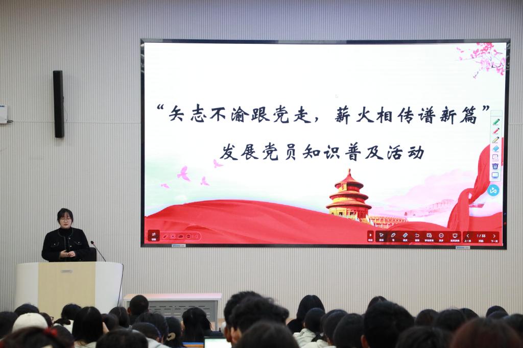 针对入党流程,王艺静从申请入党起步,依次讲解入党积极分子的确定和培养教育、发展对象的确定和考察、预备党员的接收,直至预备党员的教育考察与转正,将五个关键环节的要点清晰呈现。她特别提醒,新生要加强理论学习、提升思想觉悟、做好学业规划、积极服务社会,以努力奋进的姿态勤学实干、追求卓越,在全面发展和践行初心中积极向党组织靠拢。