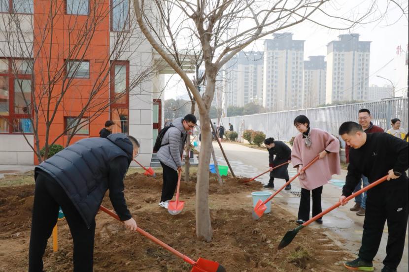 活动现场氛围热烈非凡,师生们热情高涨,干劲十足。在植树过程中,从挥锹铲土时的用力挥动,到扶苗填坑时的小心翼翼,再到浇水灌溉时的认真专注,每一道工序大家都做得一丝不苟。师生间配合默契,彼此协作,共同为校园种下一棵棵满含希望、充满生机的树苗。这些树苗在未来将茁壮成长,为校园增添一片新绿,见证着曲园师生的付出与收获。