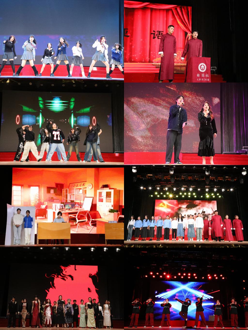 晚会在开场舞《Badvillain》中拉开帷幕,唯美而活力四射的舞姿激起了同学们对晚会的浓厚兴趣;歌曲《像你这样的朋友》唱出了同学间浓浓的友谊情,《手心的蔷薇》用优美的旋律讲述着关于成长与青春的故事;相声《学哑语》引得全场哄然大笑;小品《!!!》幽默不断,将全场的气氛推向高潮;舞蹈《燎原》《Girls Never Die》《Boom》展现出曲园学子昂扬向上的青春活力;新中式走秀《国韵千年》,话剧《如愿》,武术《武动乾坤》,民器、民舞《秦淮青华夜》展现出丰富的民族文化底蕴,也坚定了同学们的文化自信。