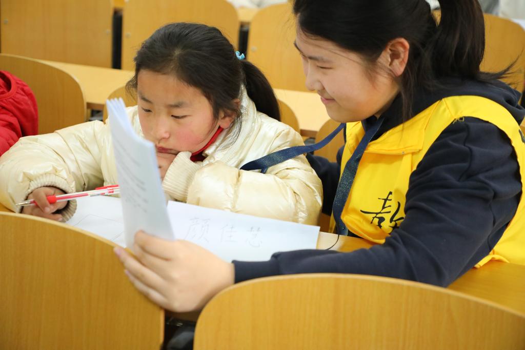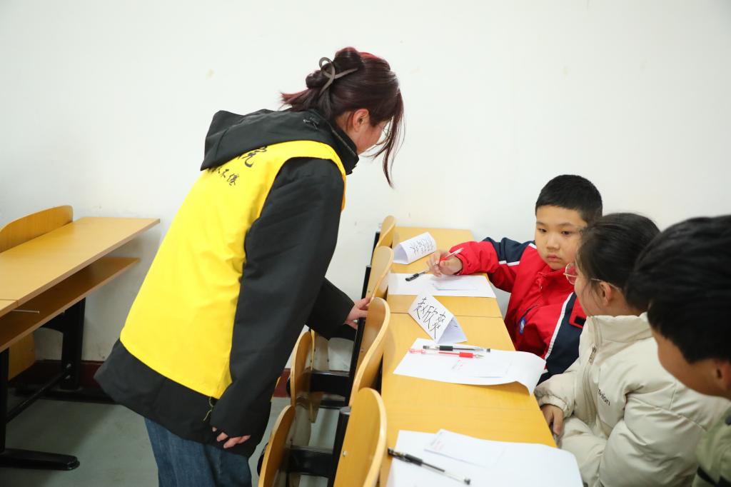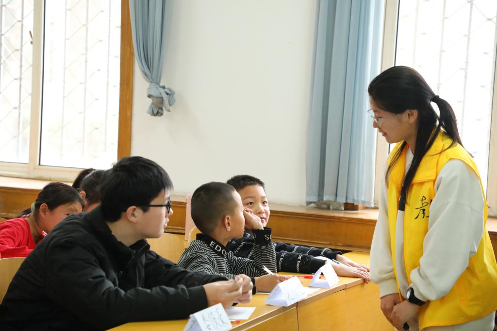 于子桐、田依凡等师范生组成的志愿服务队,为20余名困境儿童集中讲授自研开发的儿童社交课程——“特别的我们”。她们以“特别的我”、“特别的人”两个互动活动引导孩子们认识独一无二的自己,了解身边对自己重要的人。课堂上,小朋友们认真听讲、积极参与,志愿者们循循善诱、耐心指导,双方热情互动,建立了信任与友谊,教室里充满了欢声笑语。