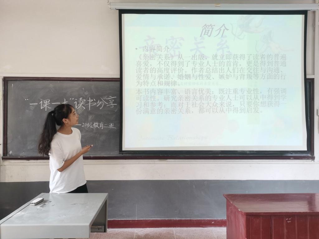 2020级教育二班赵欣同学分享的书籍是《亲密关系》。他介绍了亲密关系主要分为“月晕、幻灭、内省”三个阶段,“欣赏你的伴侣,表达你的感激,重复上述两步”是保持亲密关系的秘诀。当遇到问题是不应逃避、消极、陷入负面情绪相互作用的怪圈,而应该有更多的包容和理解,把遇到的问题当做自我成长的契机。