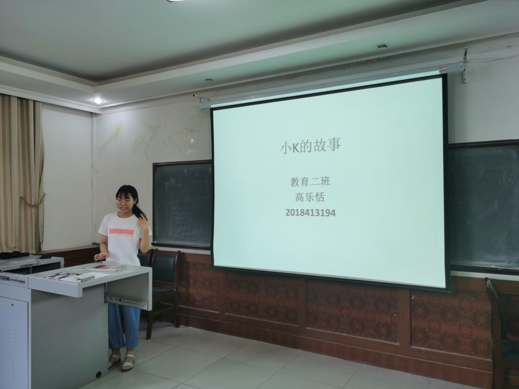 教育二班高乐恬同学在实习中观察细致,体贴同学。在实习分享会上,她绘声绘色地讲述了她与小K的故事。当讲到小K的原生家庭境况悲惨时,观众席下已有人眼圈红润,泪眼婆娑,对小K的遭遇产生了共情。